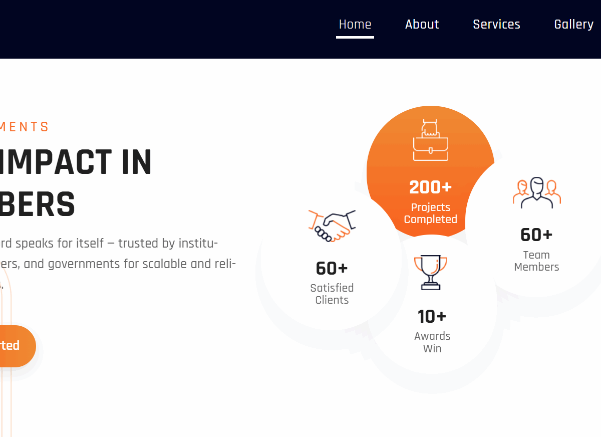 Impact Metrics Section: Added an engaging statistics section to display completed projects, awards, team members, and client satisfaction numbers.